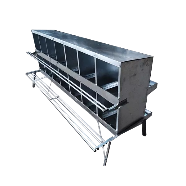 Каркас гнезда-секции 2-х ярусный, односторонний, этажерчатого типа, установлен на подставки. На каждом ярусе 7 гнезд. Линия гнезд может размещаться как посредине помещения, так и вдоль стен птичника.